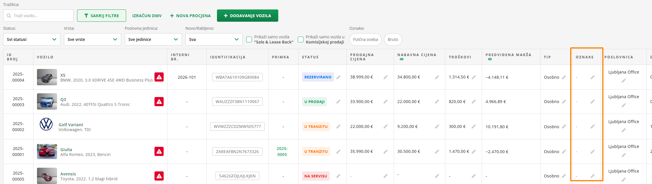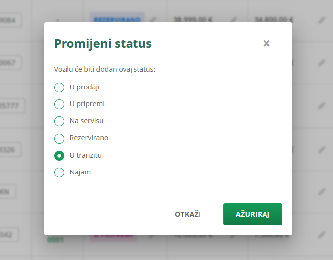 Kliknite AŽURIRAJ i vozilo će imati status. Tako možete filtrirati zalihu i po statusima.