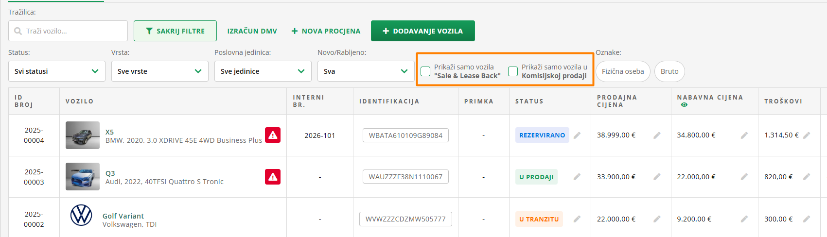 Ako imate vozila u Sales&Lease back ili u komisijskoj prodaji, dobro će vam doći i filtri koji filtriraju samo vozila koja sadrže jednu ili obje oznake. Aktivira ih se klikom na kućicu.