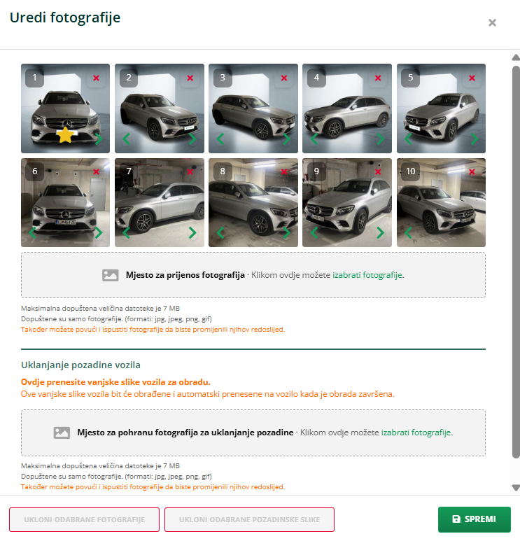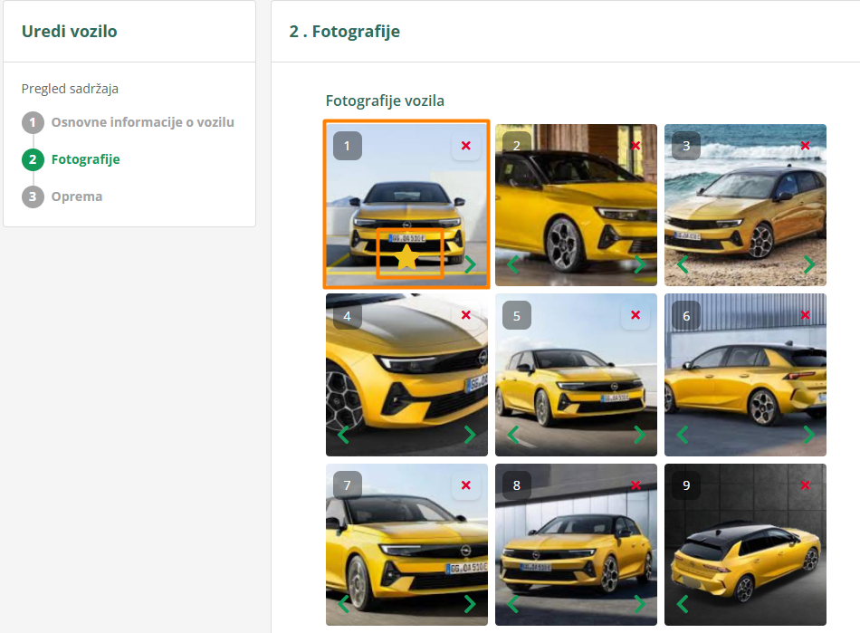 Naslovna fotografija, koja ima ispod simbol zvjezdice, uvijek je prva fotografija. Ona će vam se uvijek prikazivati zajedno s vozilom. Ako je želite zamijeniti, lijevim klikom miša povuci drugu fotografiju na prvo mjesto, ili kod željene fotografije klikni zvjezdicu.