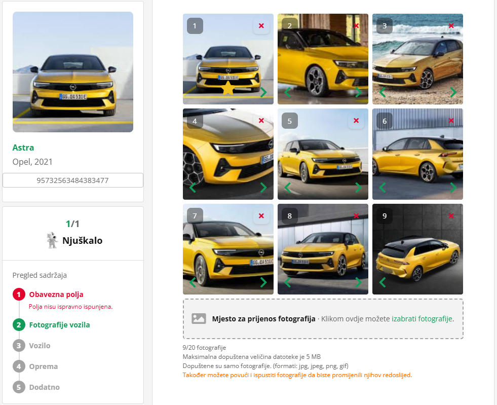 Kada želite oglašavati vozilo, odaberite pružatelja usluge i kliknite na gumb OGLAŠAVANJE VOZILA. Idite na korak koji sadrži fotografije. Automatski se prikazuju sve fotografije, koje ste dodali vozilu.