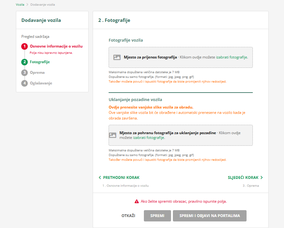 U drugom koraku unosa vozila možete dodati fotografije vozila i objaviti ih zajedno s vozilom na zalihu. To je najlakši način za dodavanje fotografija koje vam mogu dobro doći u svim postupcima oglašavanja.