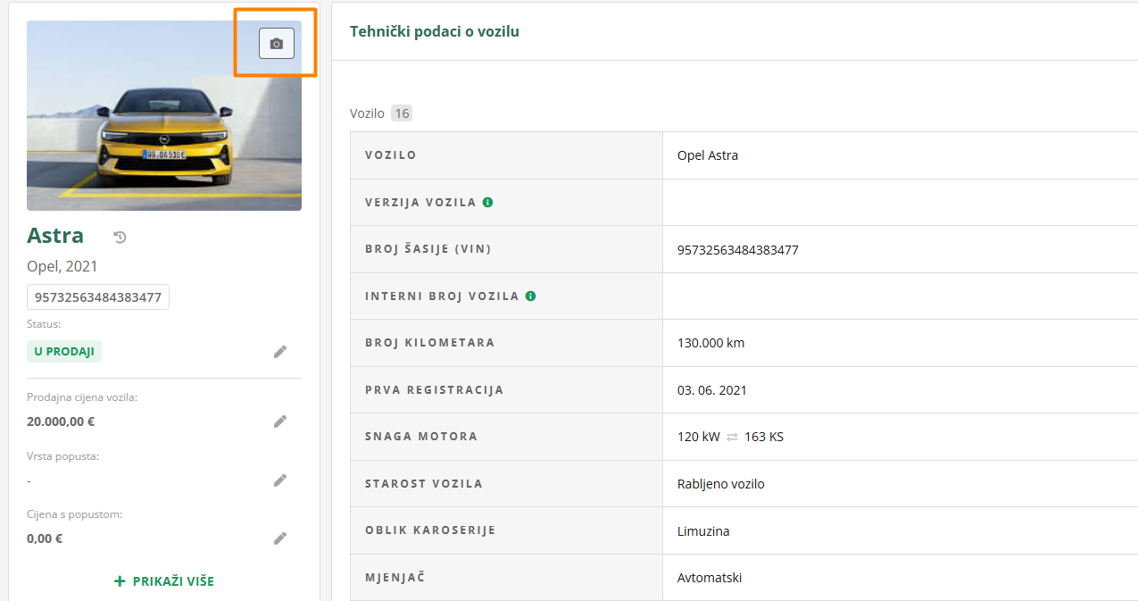 Druga, brža mogućnost je da kliknete na ikonu fotoaparata pored glavnih podataka vozila.