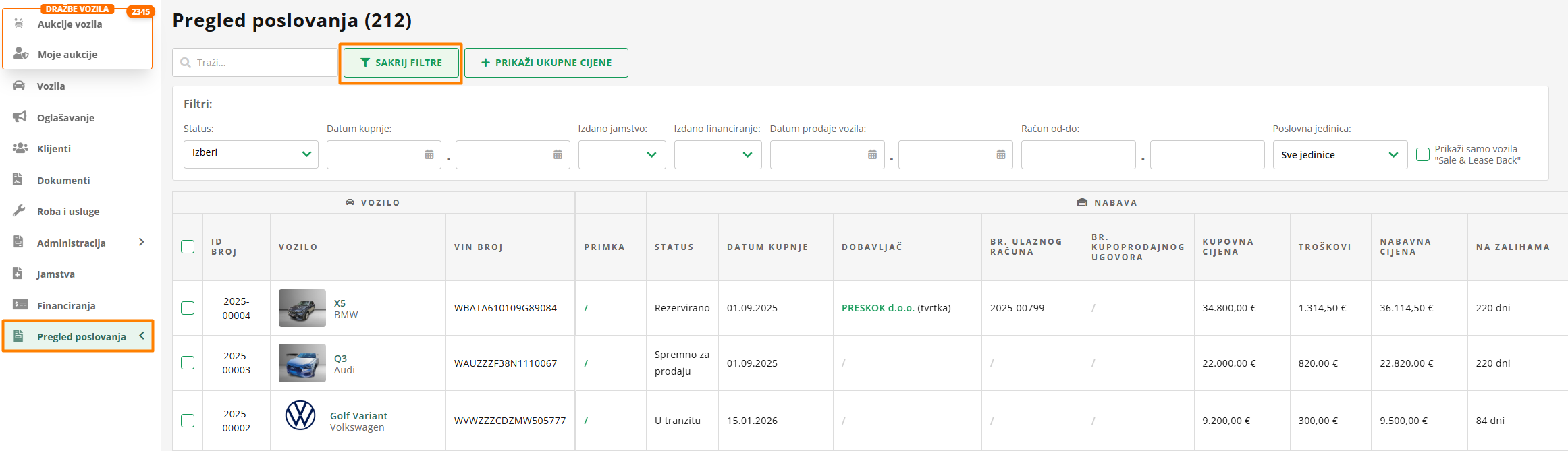 U modulu Pregled poslovanja, definiraj filtre koje želite primijeniti na pregled zaliha. To učinite klikom na Prikaži filtre – desno od tražilice.