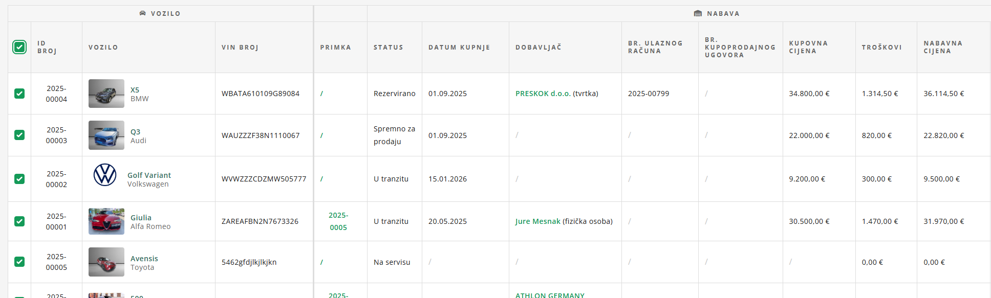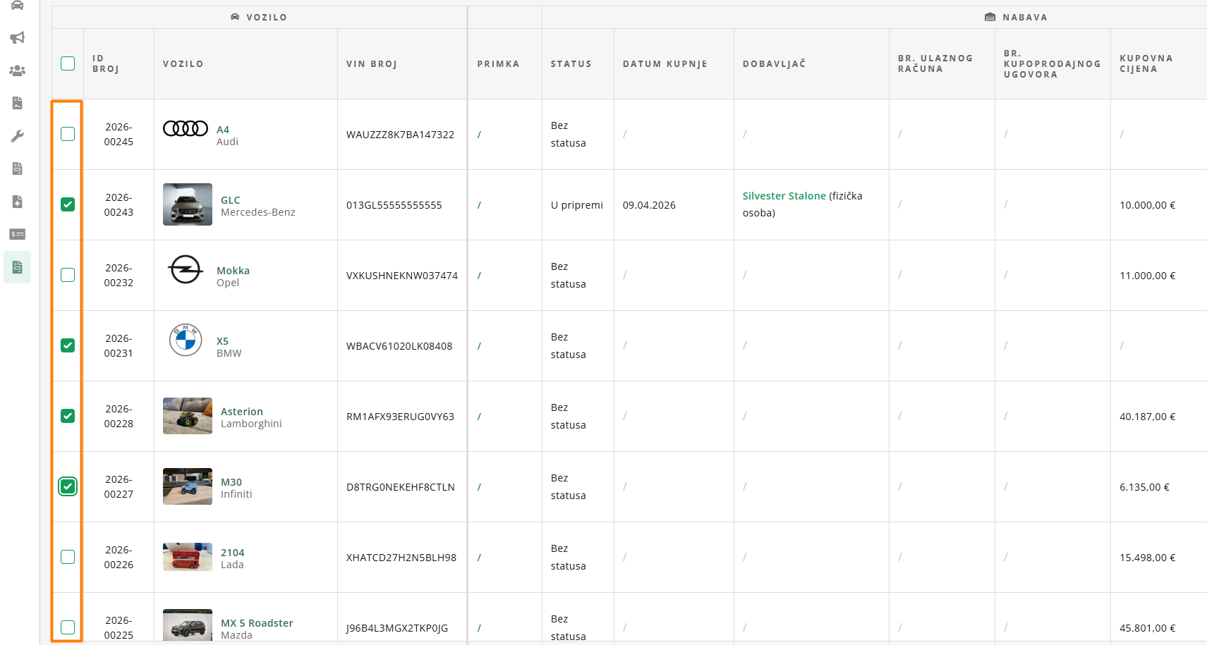 Klikom na prazan kvadrat pored vozila u prvom stupcu odaberite sva vozila koja želite izvesti.
