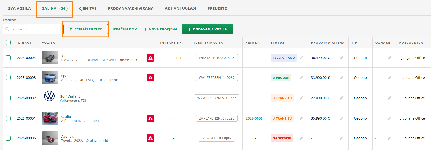 - Otvori karticu VOZILA i kliknite na odjeljak ZALIHE.
