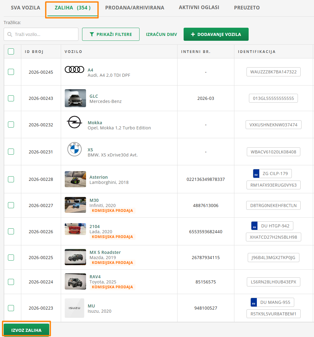 Klikom na IZVOZ ZALIHA preuzet ćete u datoteci Excel na svoje računalo samo sva ona vozila koja su bila na vašoj zalihi na dan označen na filtru.