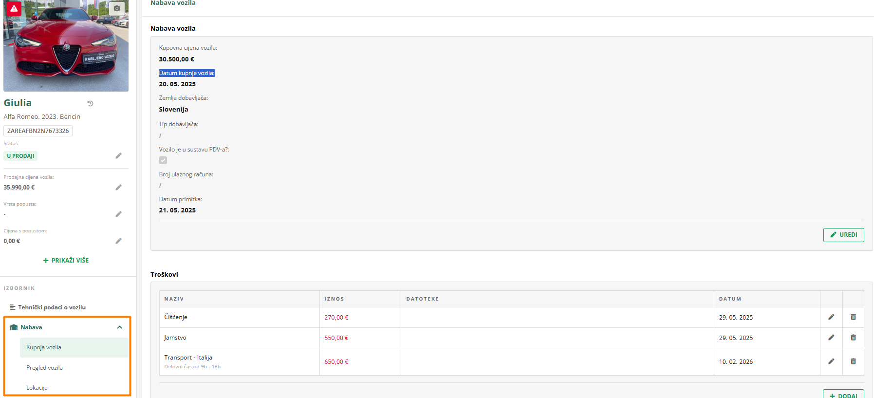- Kupnja vozila, gdje možete unijeti sve podatke o nabavi vozila, troškovima i dobavljaču vozila. Možete priložiti i kupoprodajni ugovor i zapisnik o primopredaji ili ugovor o komisionoj prodaji te CMR dokument i COC certifikat.