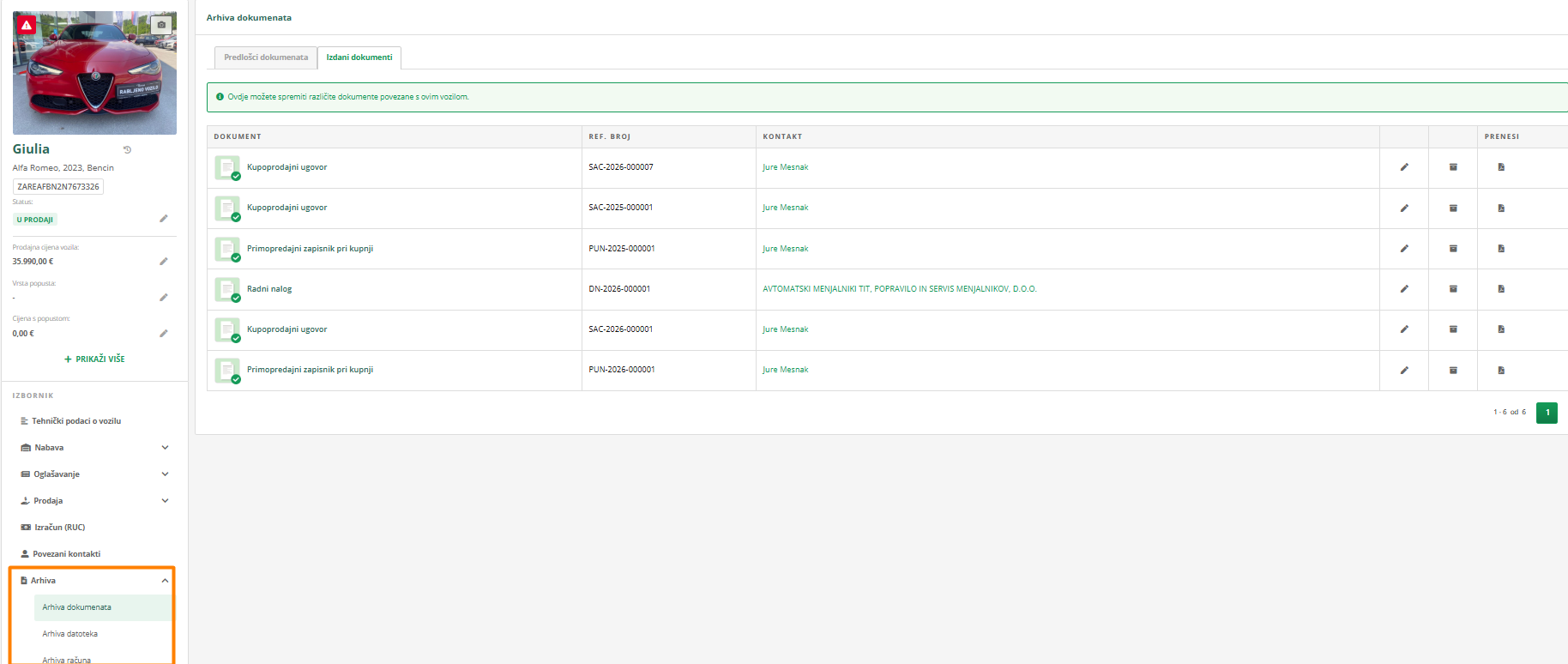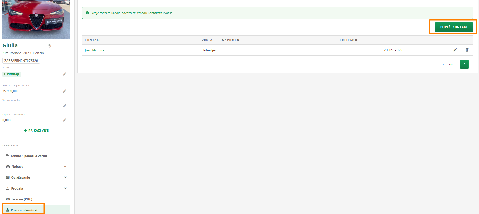 Kontakti se automatski prikazuju i kada na vozilo vežete dokument ili radnju koja je vezana za kontakt (npr. servis vozila ili priprema kupoprodajnog ugovora).
