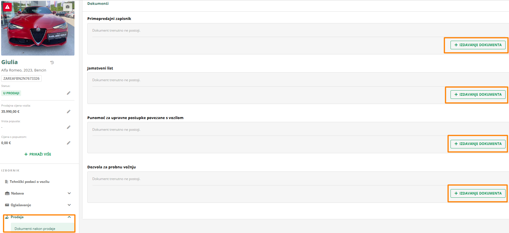 Prvi dio Dokumenti prilikom prodaje je pripremljen za brzo izdavanje dokumenata prilikom prodaje vozila. Tako možete izdati Zapisnik o primopredaji, Jamstveni list, Punomoć za upravne postupke te Dozvolu za probnu vožnju.