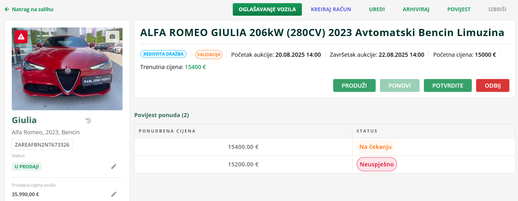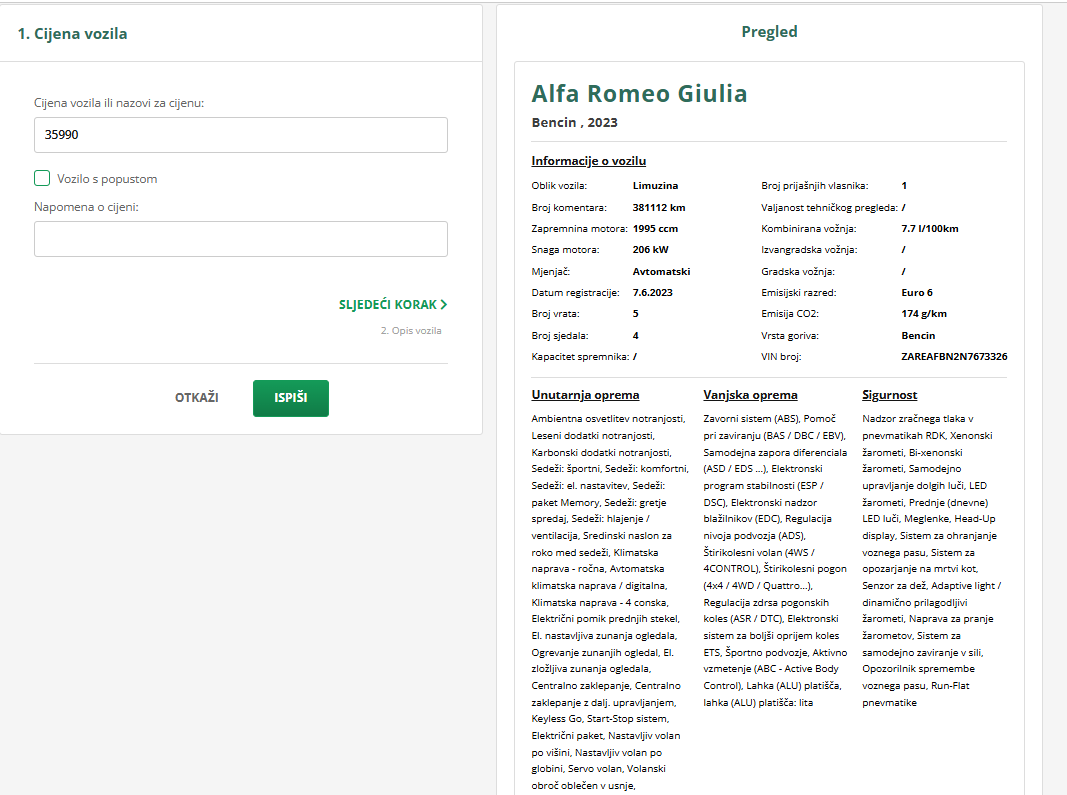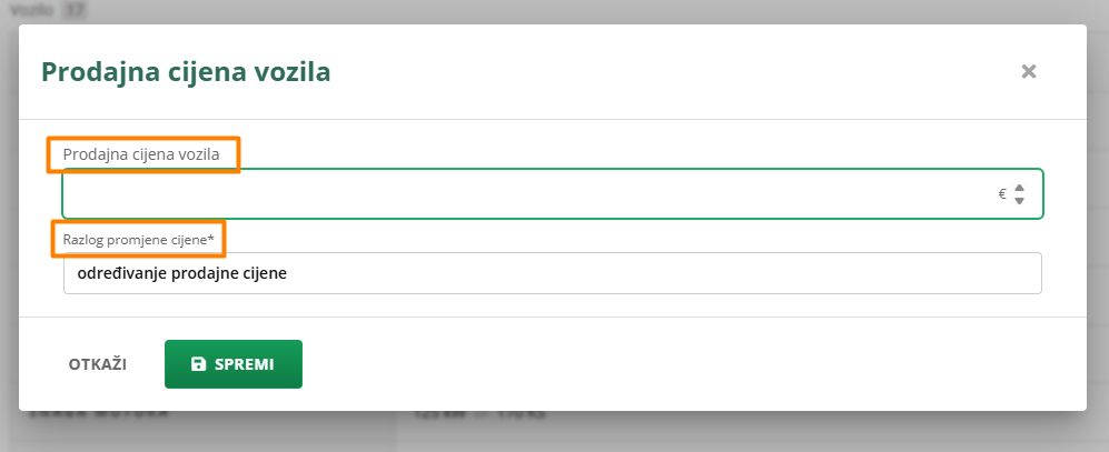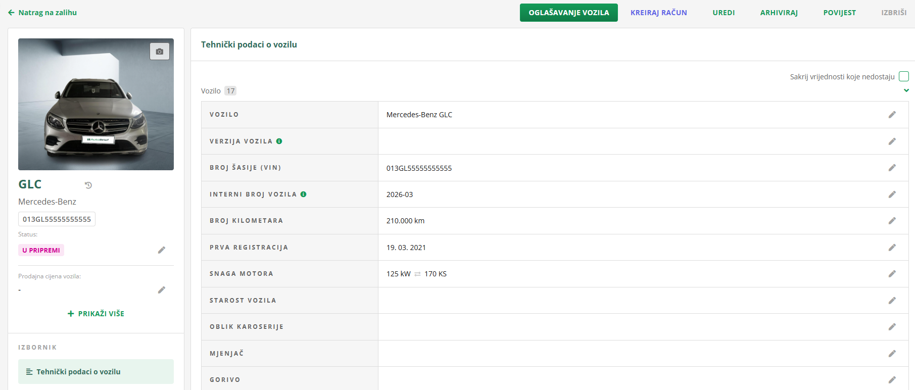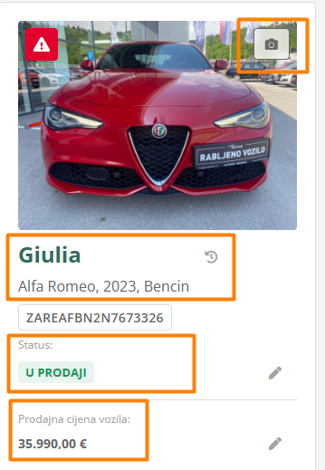 Posljednje dvije stavke (status vozila i prodajna cijena vozila) moguće je uređivati bilo kada klikom na ikonu olovke