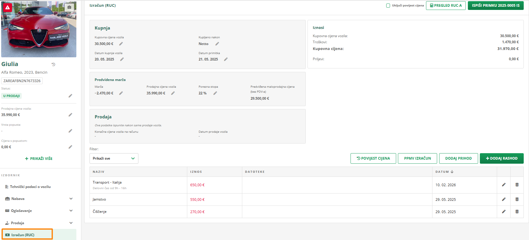 Klikom na karticu Izračun (RUC) dolazite do pregleda svih troškova i prihoda koje ste imali za ovo vozilo. Na taj način točno znate gdje ste s troškovima i koliko još možete spustiti cijenu kupcu.