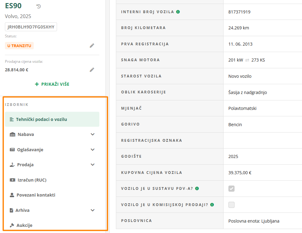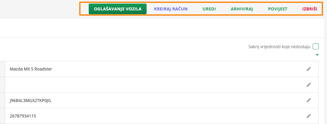 Ispod glavnih podataka imate izbornik, na kojem možete odabrati sve radnje koje će se dogoditi s navedenim vozilom.