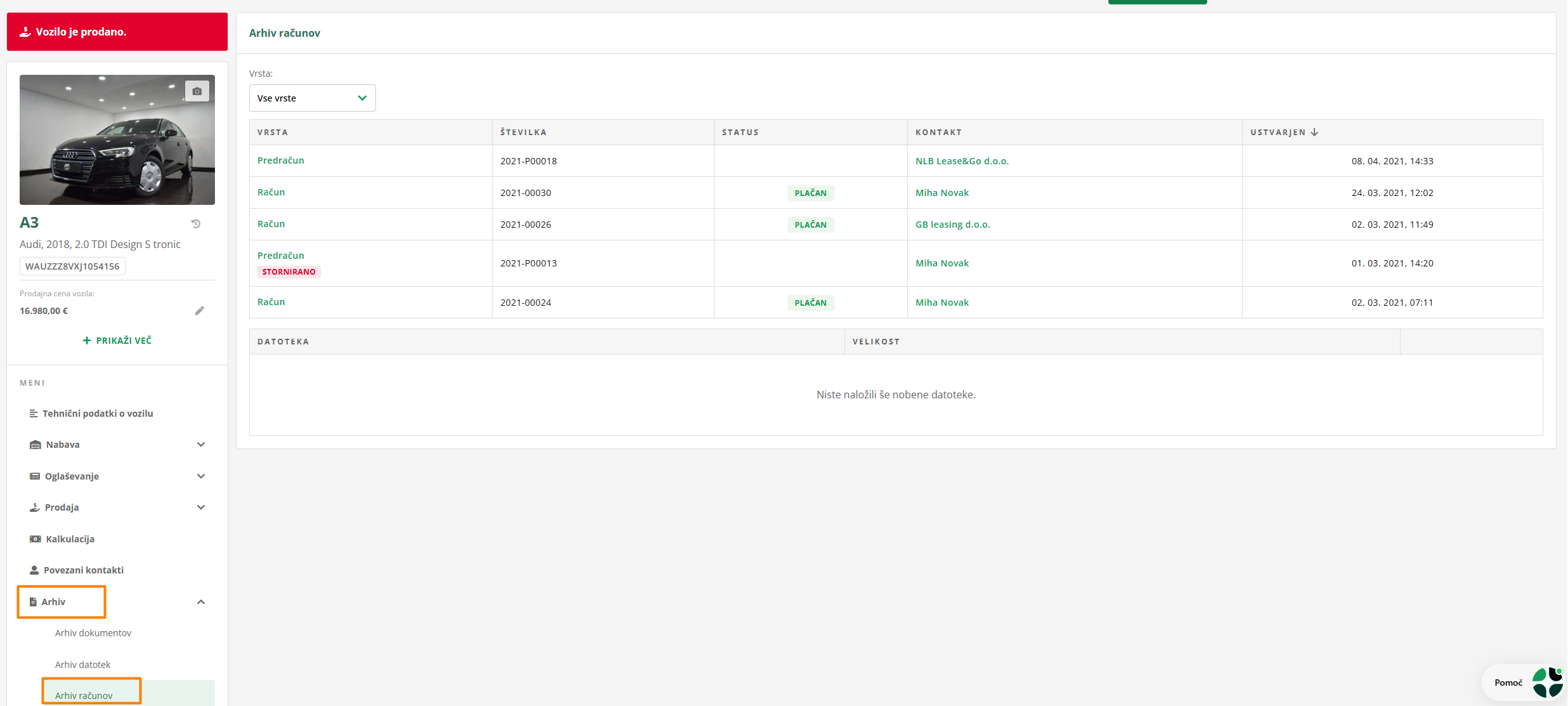 V Arhivu so vedno na voljo vsi računi, dokumenti ali datoteke, ki so vezane na to vozilo.