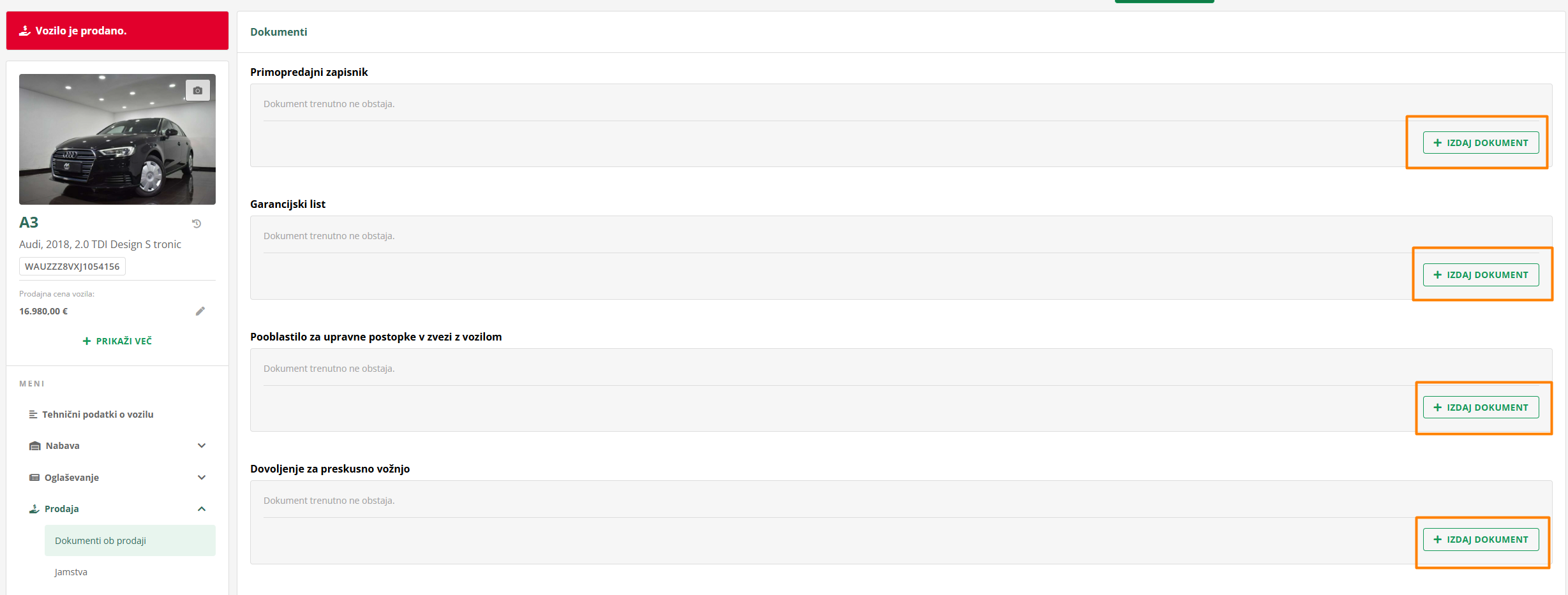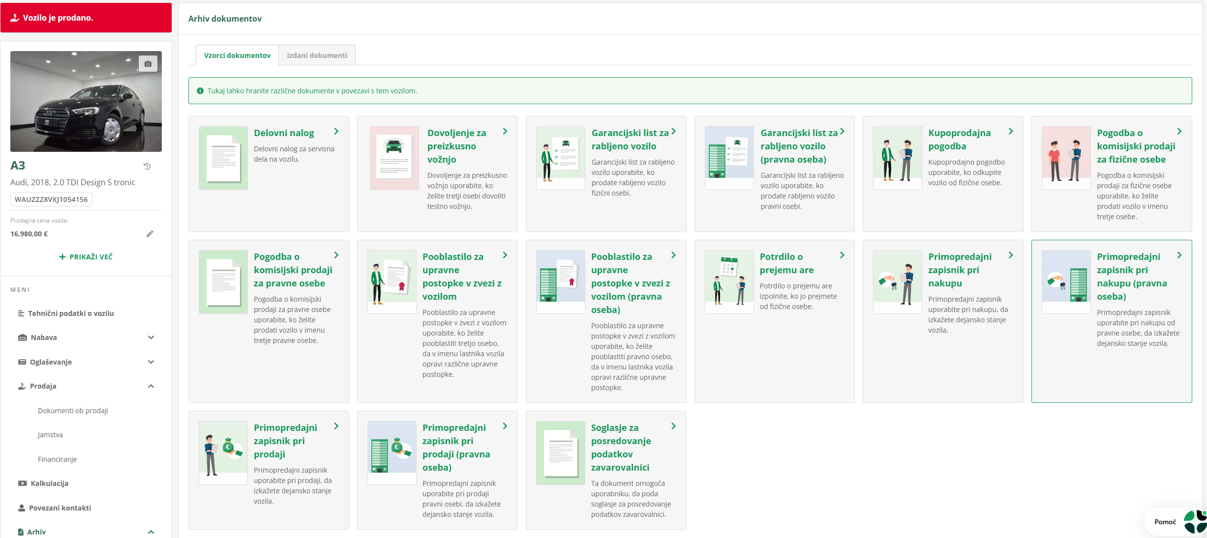 Na zavihku Prodaja so na voljo tudi dokumenti ob prodaji, ki jih lahko vežeš na vozilo tudi po tem, ko je prodano. Tukaj lahko izdaš Primopredajni zapisnik, Garancijski list, Pooblastilo za upravne postopke v zvezi z vozilom in Dovoljenje za preskusno vožnjo.