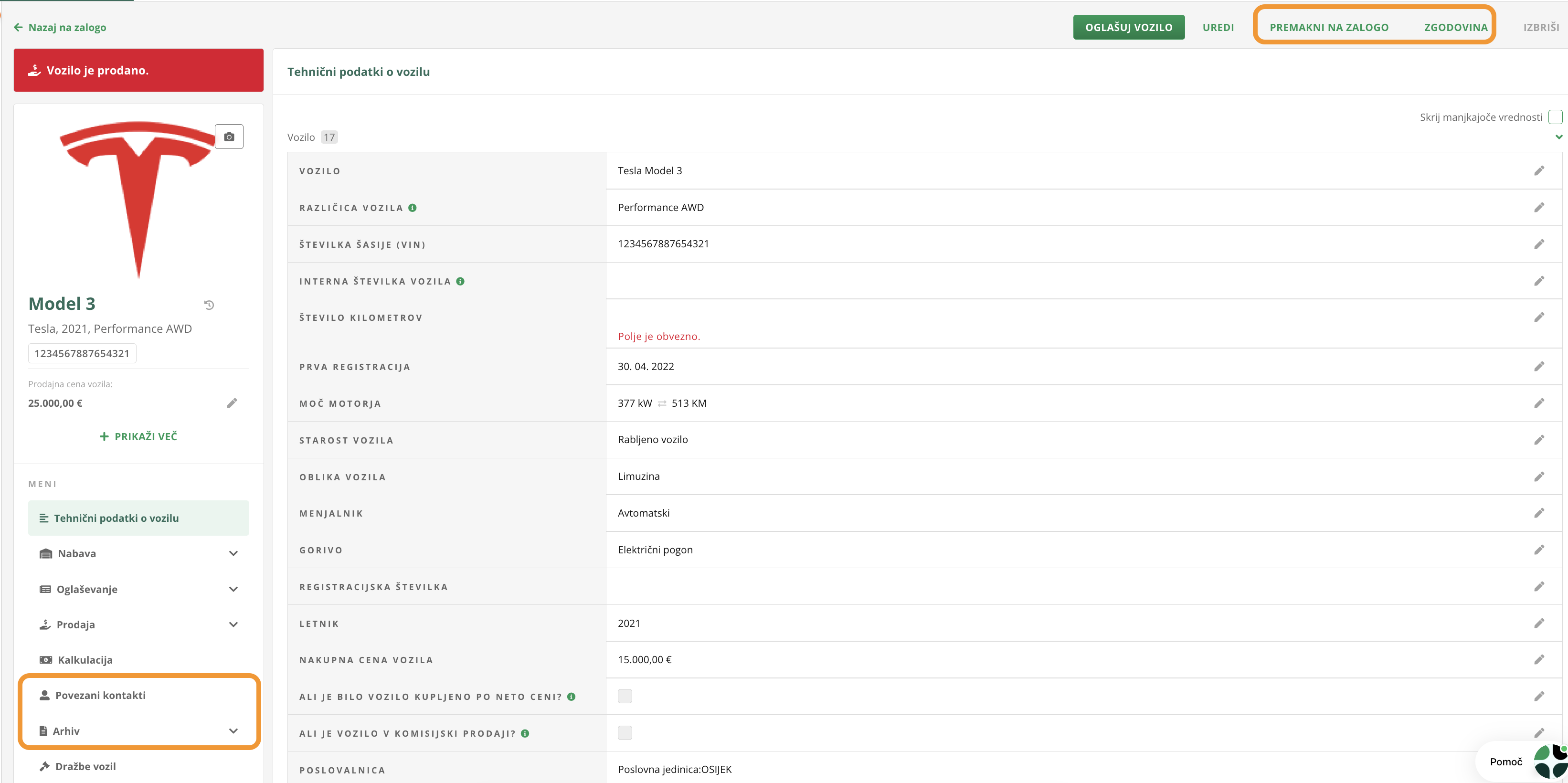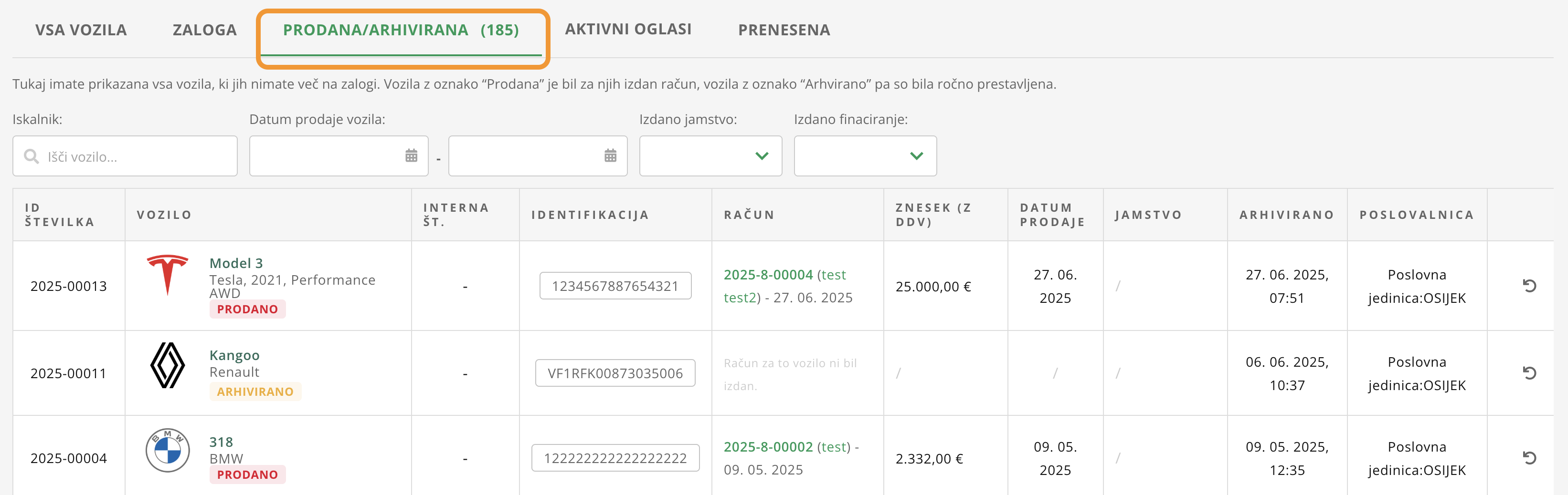 Ko se določeno vozilo proda, se premakne v kategorijo PRODANA / ARHIVIRANA v modulu Vozila. Čeprav je vozilo označeno kot prodano, pa lahko še vedno dostopaš do vseh podatkov o vozilu in naknadno izdajaš dokumente.