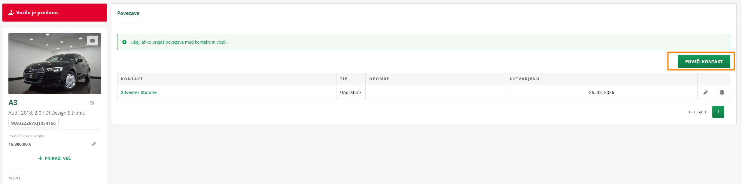 Med povezanimi kontakti pa vsi kontakti, ki si jih vezal na vozilo. Če jih še nisi vezal, lahko vedno povežeš kontakt s klikom na gumb POVEŽI KONTAKT.