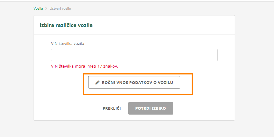 Opomba: Če sistem prek VIN številke ne dobi nobenega vozila, potem moraš vozilo vpisati ročno. Navodila, kako to storiti, so na voljo tukaj.