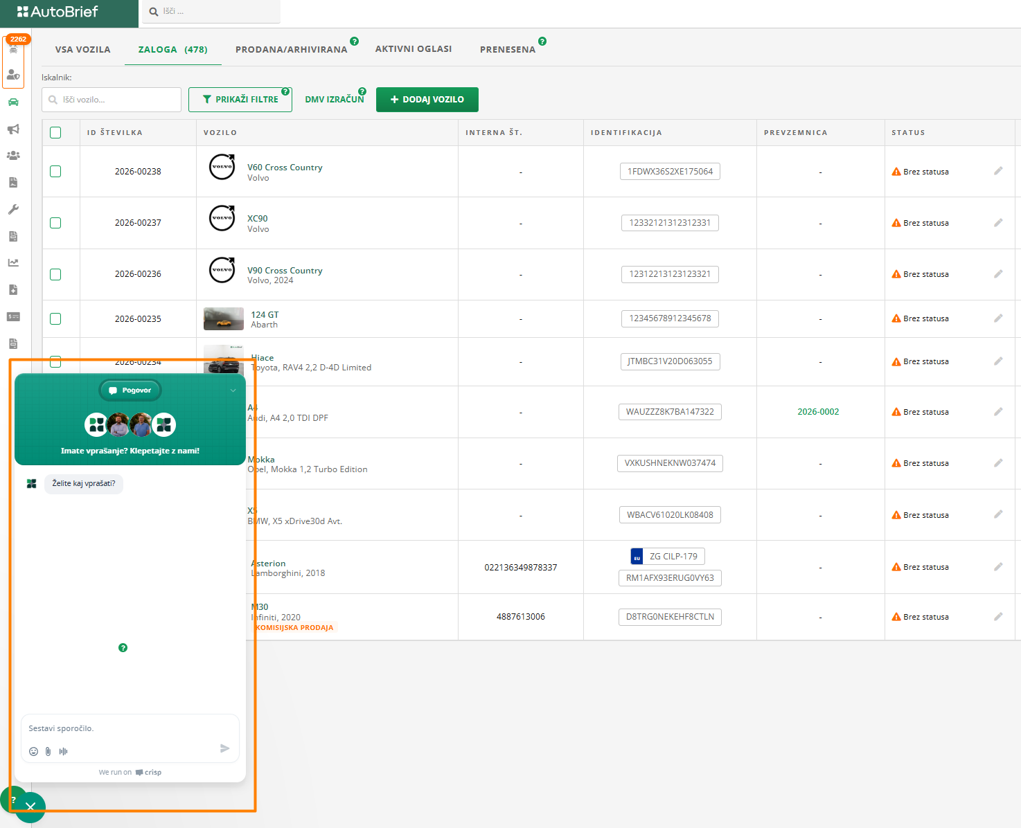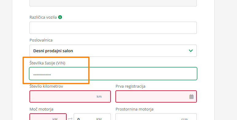 Da vozilo dodaš na zalogo, vpiši 17 pik in shrani vozilo. VIN lahko nato dodaš naknadno v urejevalniku vozila.