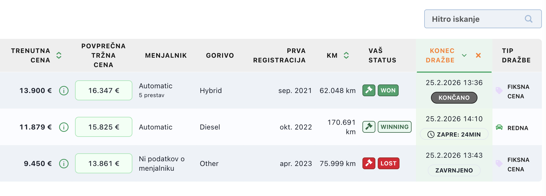 Ko se dražba zaključi in je končni status označen kot WON, pomeni, da je bila tvoja ponudba ob zaključku najvišja.