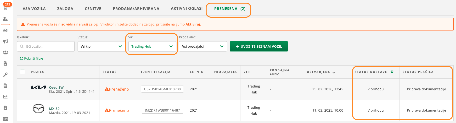 Vozilo se po potrditvi prikaže v zavihku: Vozila → Prenesena vozila. Za pregled nad vozili iz dražb, pod filtri za vir izberi Trading Hub.