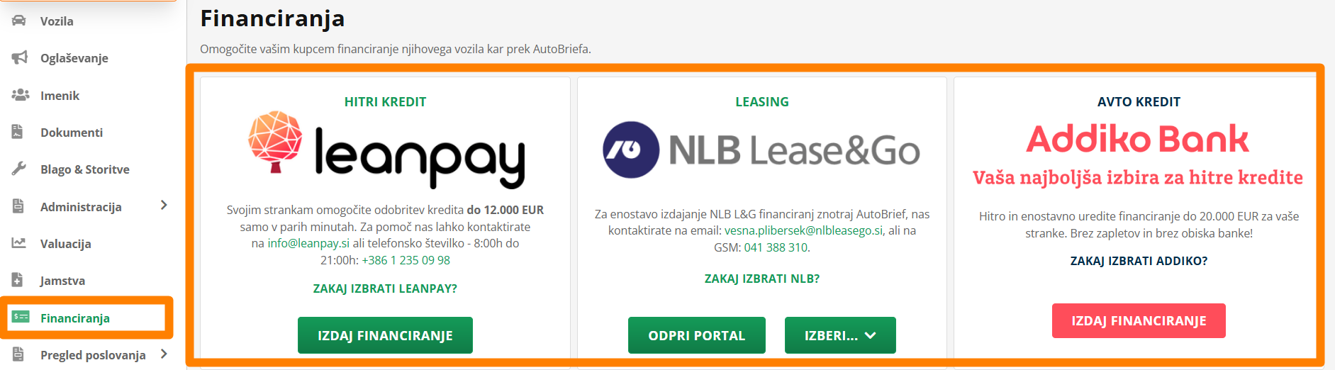 Na platformi AutoBrief lahko svojim strankam omogočiš različne možnosti financiranja vozil. AutoBrief omogoča digitalno oddajo vlog za financiranje, kar pomeni hitrost in trransparentnost oddaje vlog ter pregled nad statusi v realnem času.