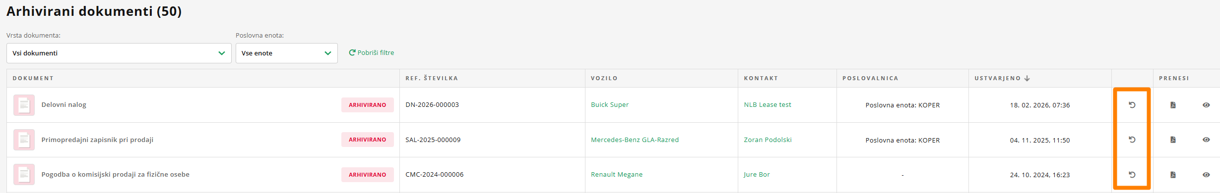 Pomembno: Dokumentov, ki so arhivirani je nemogoče urejati. Šele z ikono obnovi dokument se dokument vrne v razdelek Izdani. Tam pa se ga nato lahko ureja.
