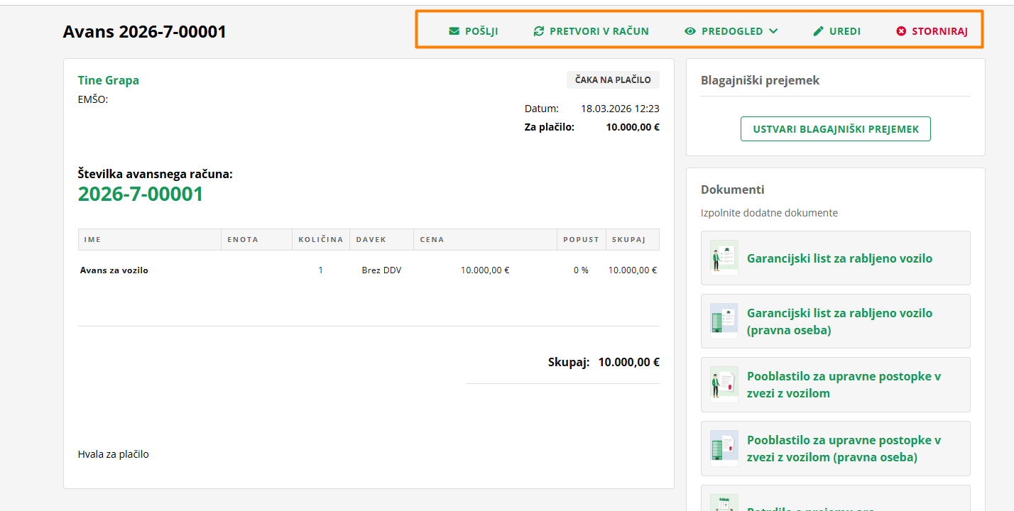 Z gumbom PREDOGLED, lahko pogledaš ali preneseš avansni račun v PDF obliki na svoj računalnik ali mobilni telefon.