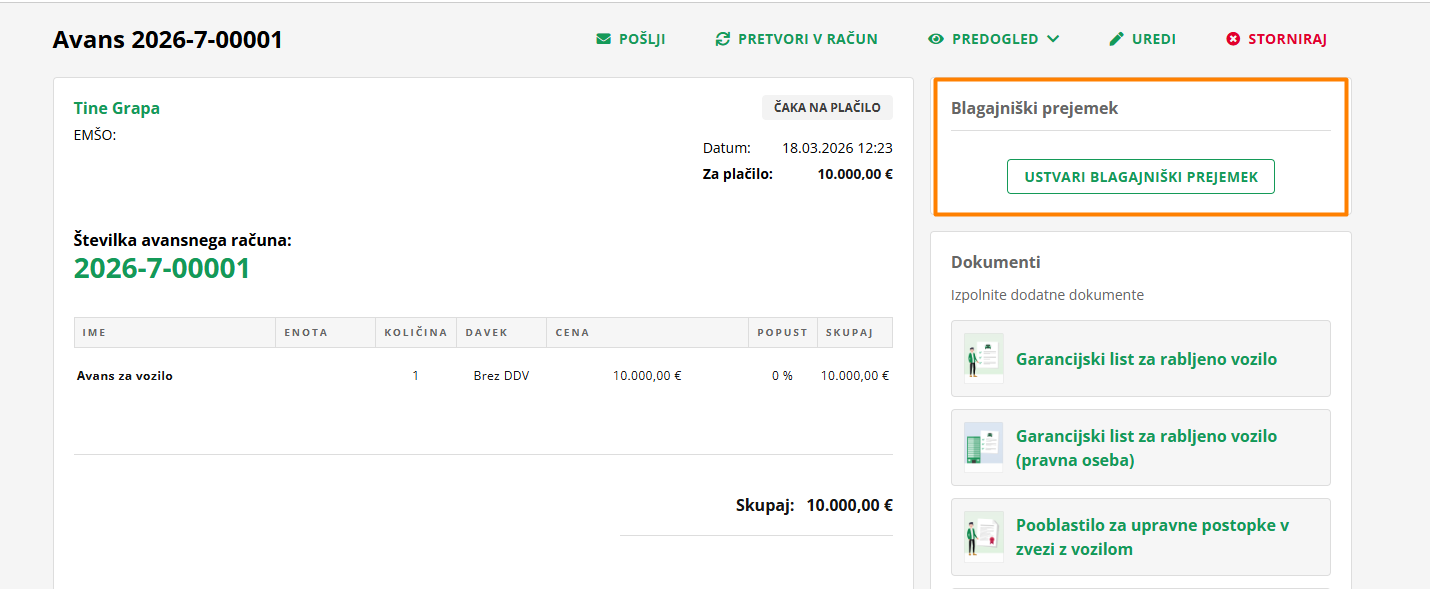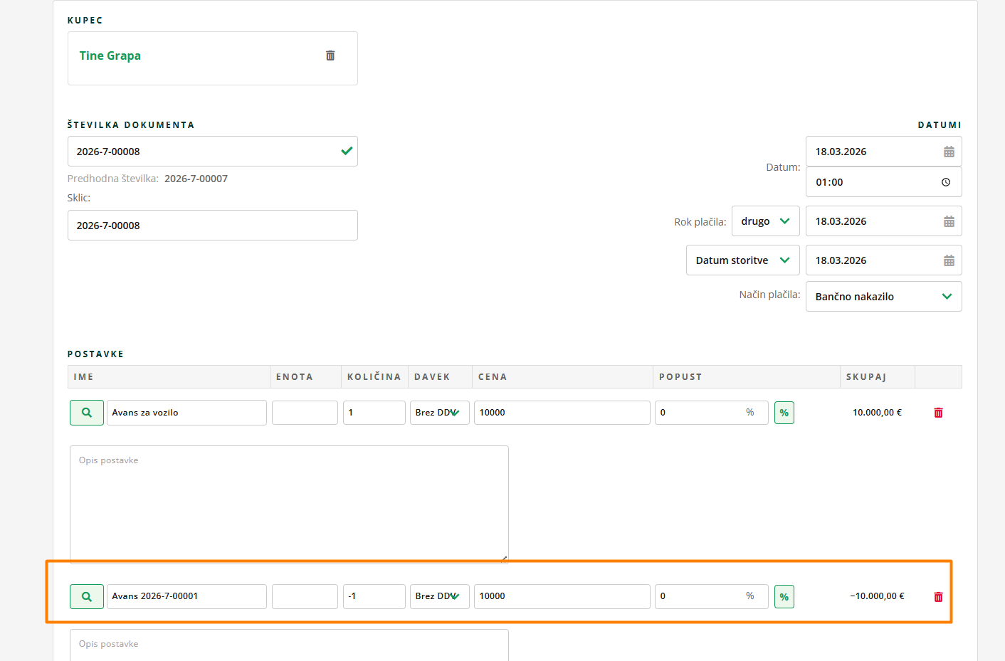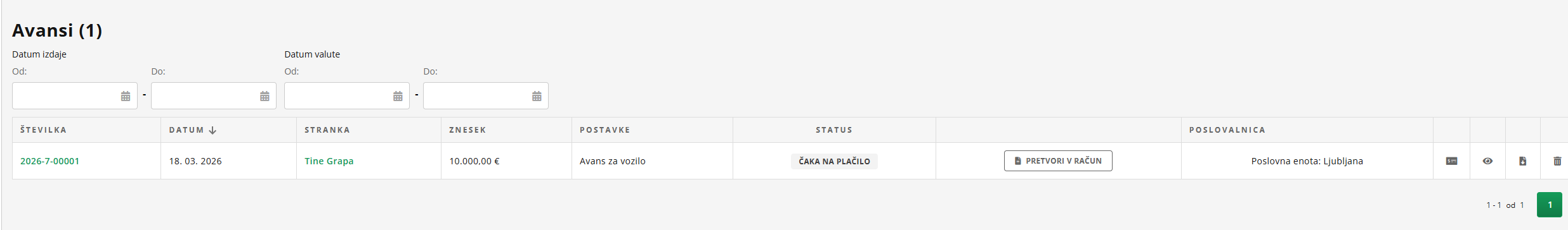 S tem se ustvari avansni račun z vpisanimi podatki.