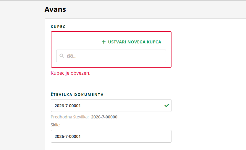Najprej v imeniku poišči kupca, na katerega boš vezal avans. Če ga še nimaš med kontakti, klikni + USTVARI NOVEGA KUPCA.