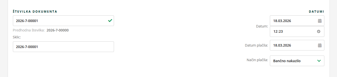 Avtomatsko se ti izpiše številka dokumenta ter sklic na levi strani ter datum, datum plačila in način plačila na desni. Vsa polja lahko urejaš.
