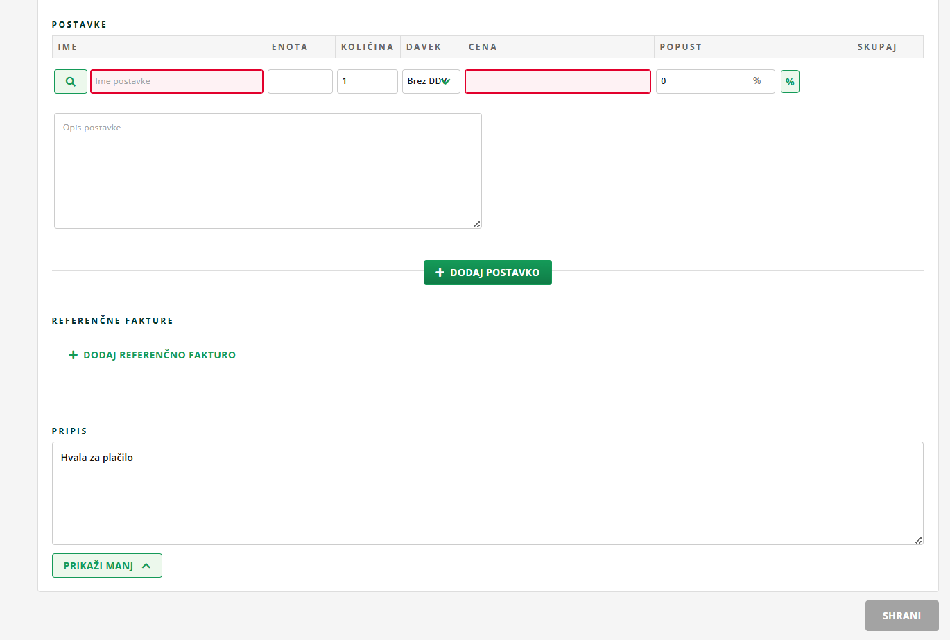 Ko vpišeš vse podatke, za katere želiš, da so na avansnem računu, klikni SHRANI.