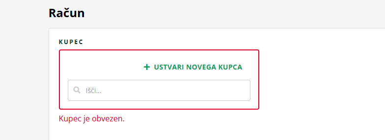 Odpre se obrazec za račun. Če kontakta še nisi vpisal, začni s tem. Poišči kupca, ki ga imaš v imeniku, ali pa ustvari novega kupca. Kako dodaš novega kupca, si preberi tukaj.