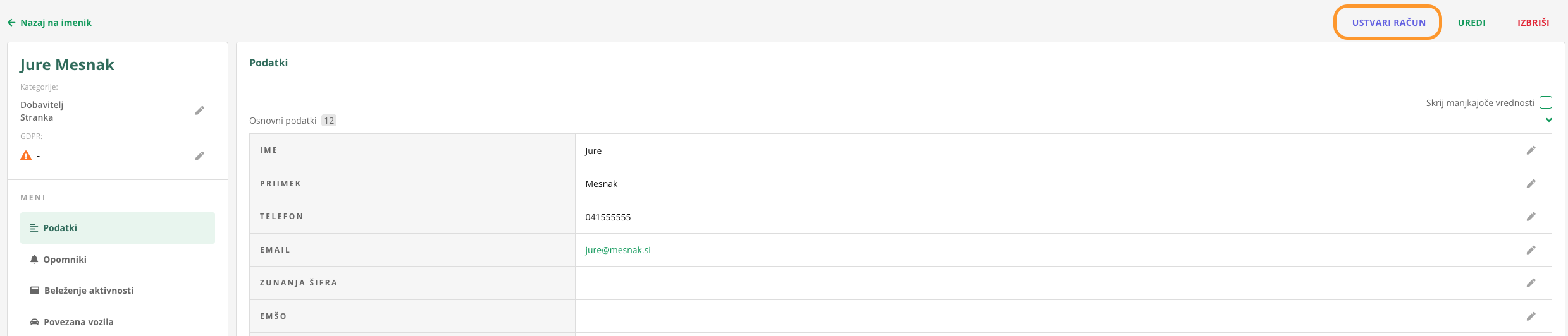 Do obrazca za izdajo računa dostopaš tudi preko kartice kontakta. Na izbranem kontaktu klikni USTVARI RAČUN.