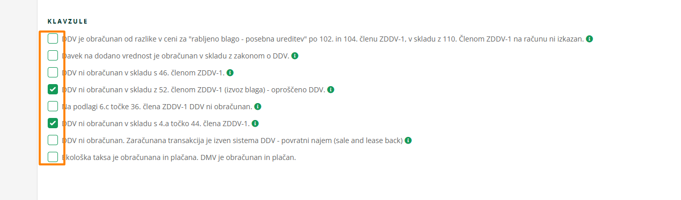 Naslednja možnost je klikanje klavzul, ki jih želiš imeti na računu. Vsaka klavzula pri kateri boš pokljukal okence, bo prikazana na računu. Kako dodaš na račun še dodatne klavzule, si preberi tukaj.