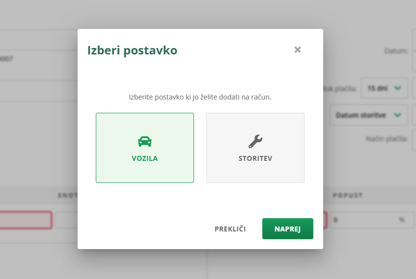 Postavko lahko poiščeš tudi tako, da klikneš na ikono z lupo. Na ta način se prikaže pojavno okno, kjer lahko izbereš vozilo ali storitev, ki jih imaš vpisane v AutoBrief. Na ta način jih brez težav povežeš z računom.