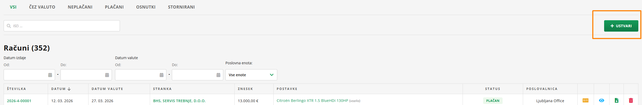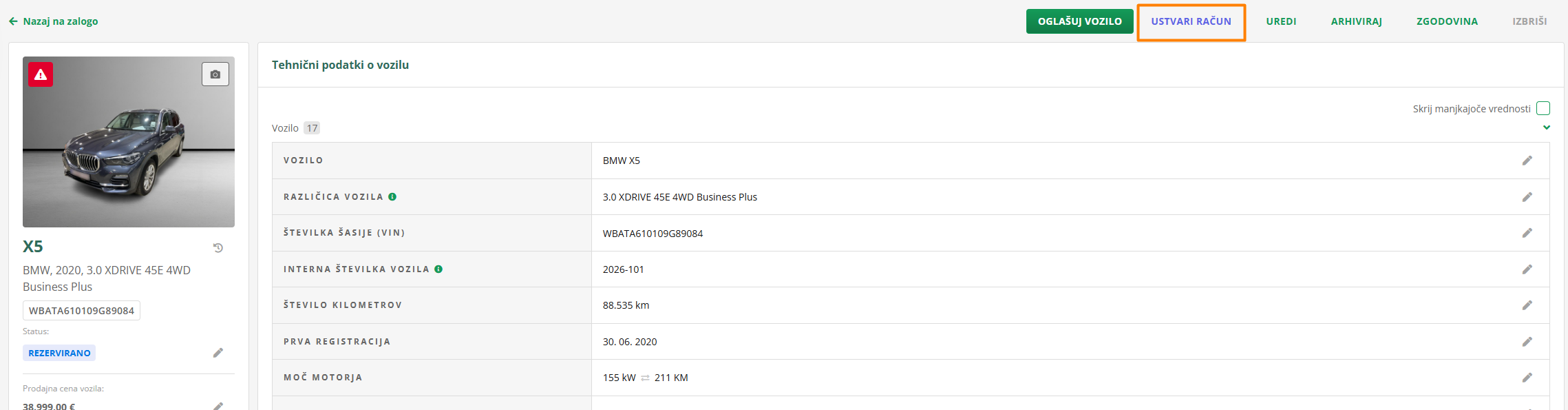 Prva možnost je direktno iz kartice vozila. Tako da na izbranem vozilu klikneš USTVARI RAČUN.