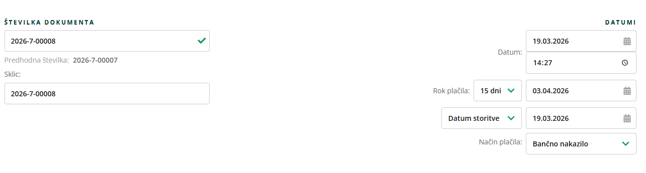 Ko dodaš kontakt, preveri podatke, ki so bili predizpolnjeni s strani sistema. Gre za številko dokumenta, sklic, datum, rok plačila, datum storitve in način plačila.