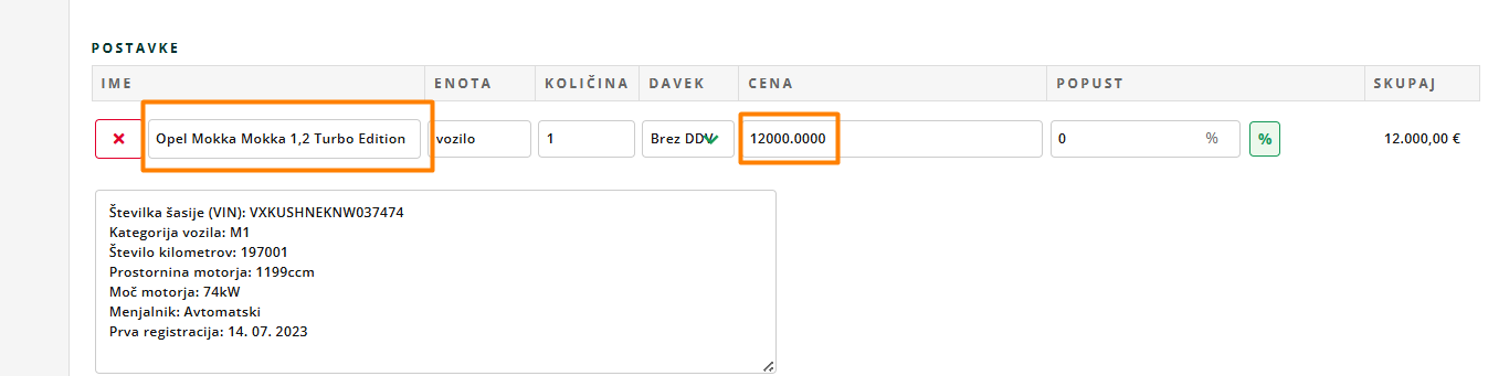 Ko si preveril podatke, moraš nujno dodati še ime postavke in ceno.