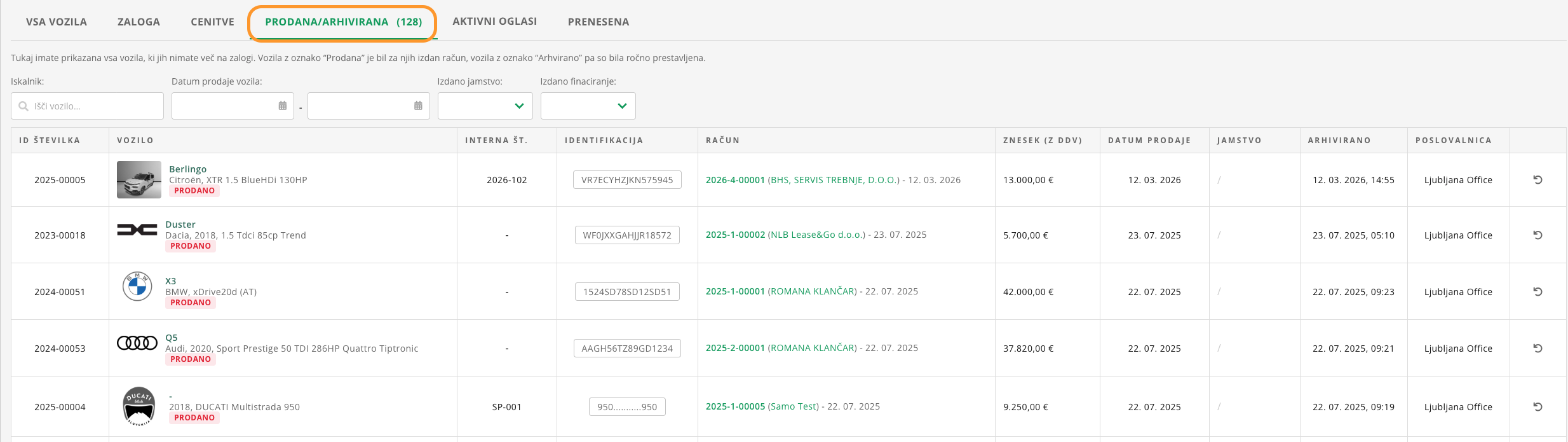 Vozilo, na katerega je vezan račun, se ob ustvarjenem računu avtomatsko prenese iz zaloge na Prodana/Arhivirana.