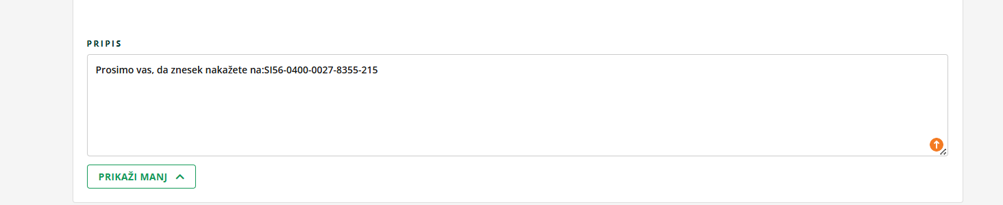 Spodaj lahko urediš še pripis, ki se bo izpisal na koncu vsakega računa. Pripis je mogoče predefinirati v Nastavitvah, kako to storiš, izveš tukaj.