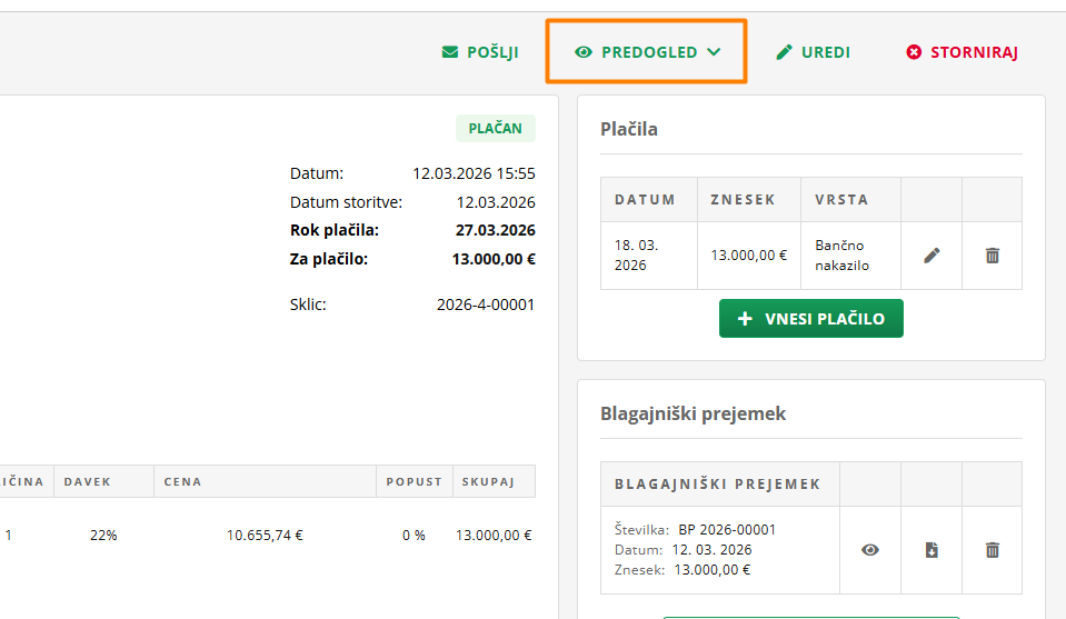To storiš tako, da greš na račun, ki bi ga rad izvozil v e-račun obliki. Zgoraj desno klikni Predogled.