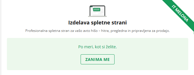 Nato pa poiščeš kartico Izdelava spletnih strani in klikneš na gumb ZANIMA ME. Zanimanje bo avtomatsko poslano na IT Melono.