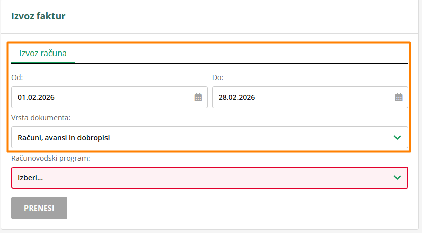 Izberi časovno obdobje in vrsto fakture, ki jih želiš izvoziti.