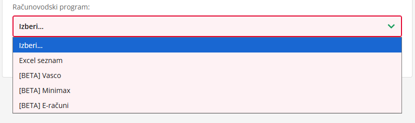 Nato izberi še računovodski program, za katerega želiš, izvoz faktur. Izbiraš lahko med štirimi: