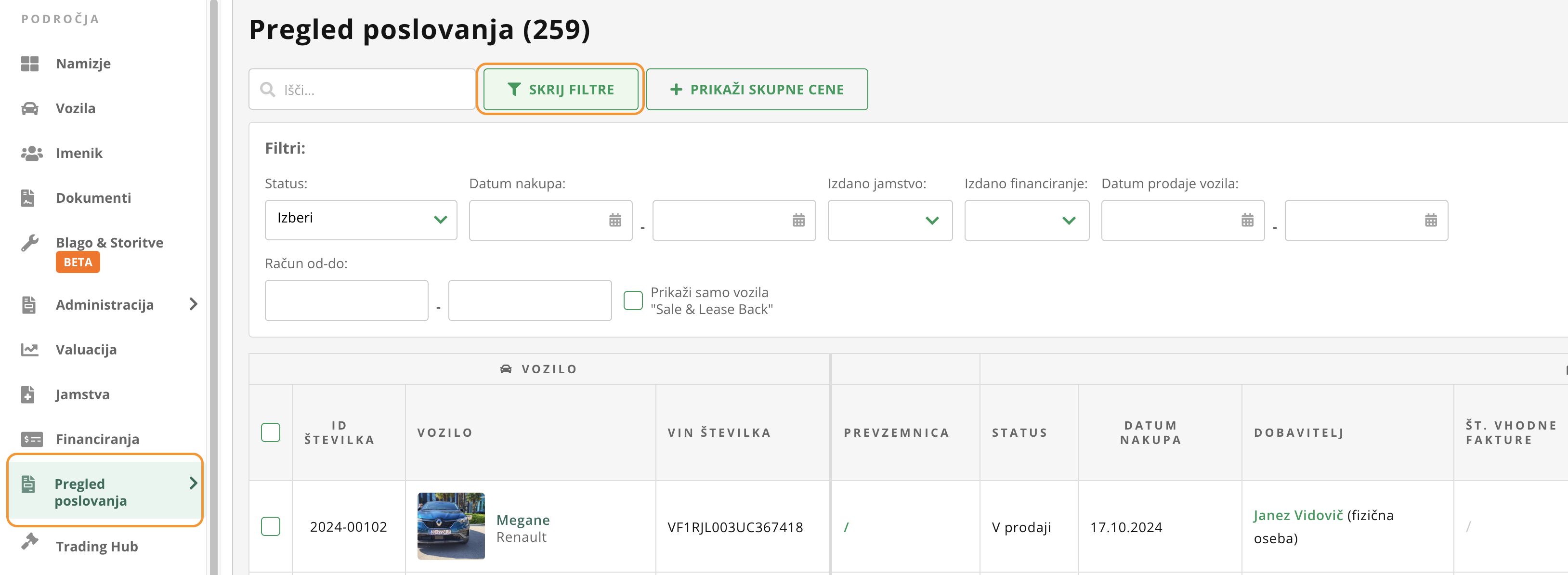 V modulu "Pregled poslovanja" določite filtre, ki jih želite implementirati na pregled zaloge to storite s klikom na “prikaži filtre” – desno od iskalnika.