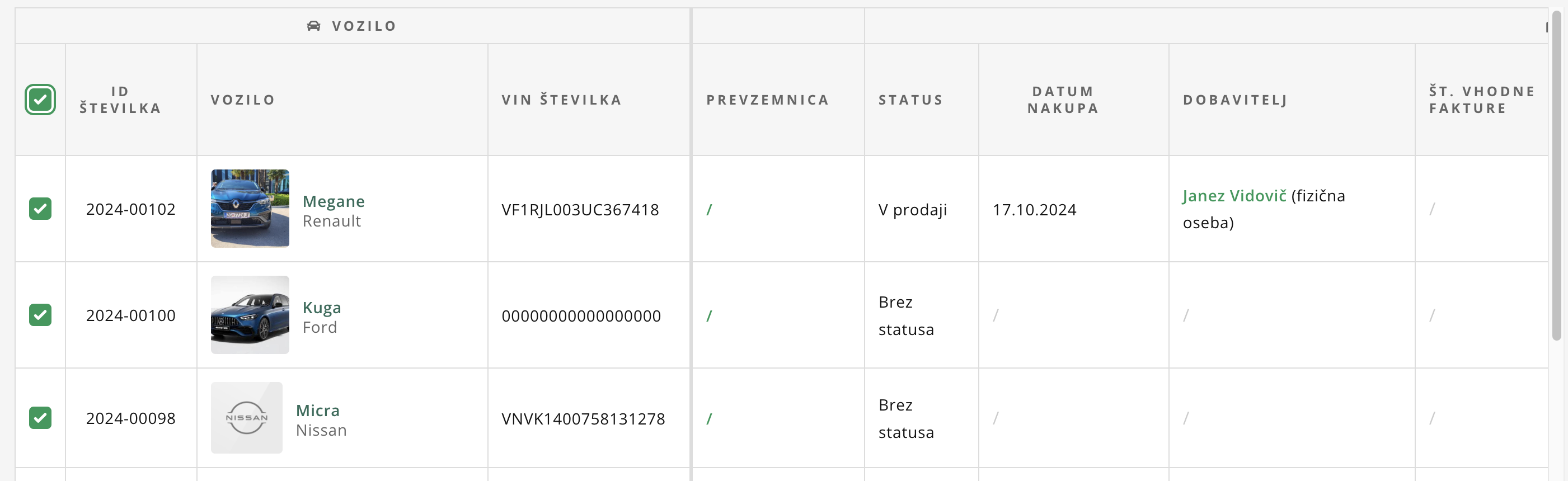 Vsa vozila lahko masovno označite na zgornjem delu orodne vrstice s klikom na kvadrat ob zapisu ID ŠTEVILKA.