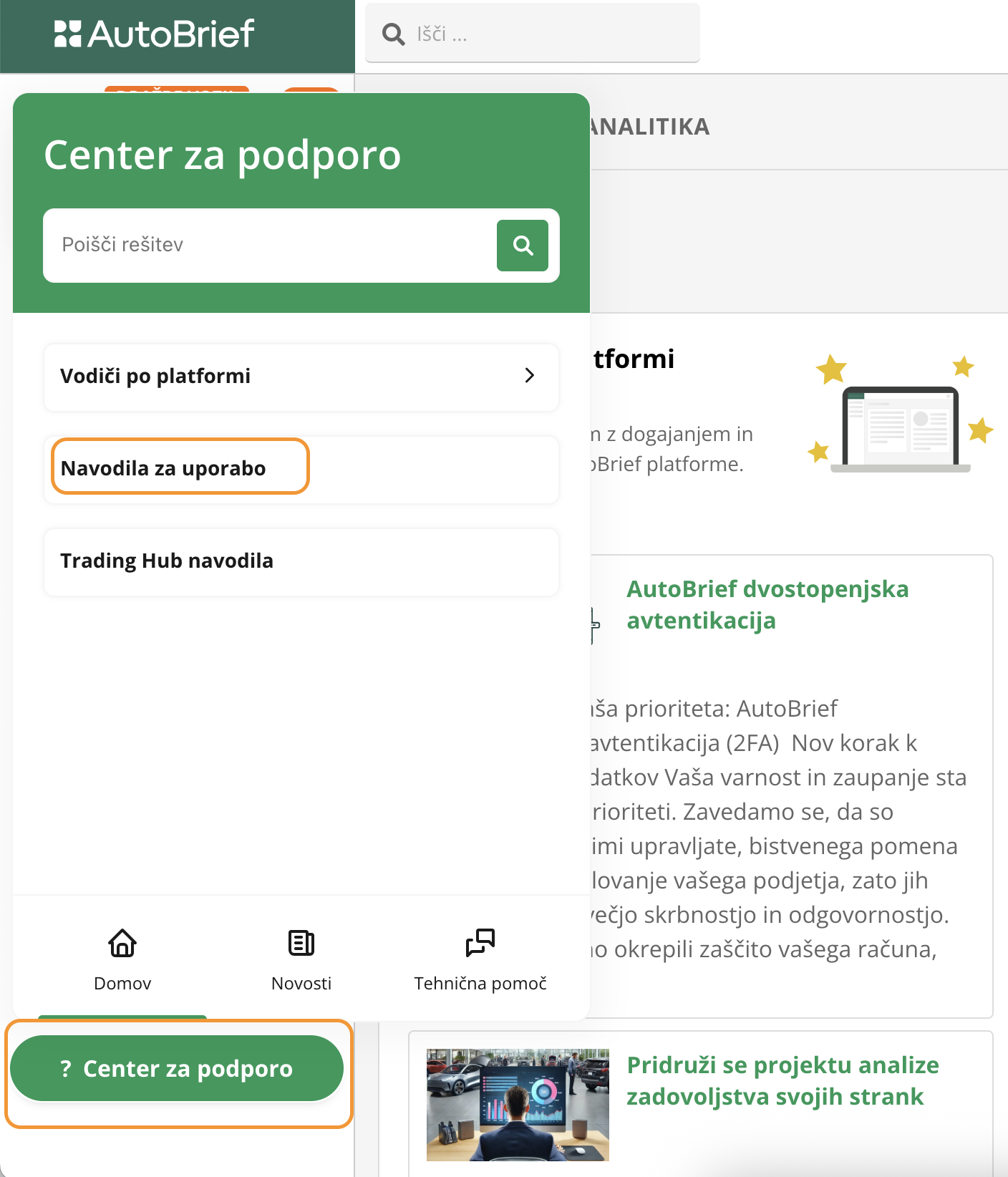 Zavihek za podporo najdeš v levem spodnjem kotu zaslona. Tu smo zate pripravili priročnike, novice in navodila uporabe. Če potrebuješ dodatno pomoč, lahko stopiš v stik z našo ekipo preko pogovornega okna za Tehnično pomoč.