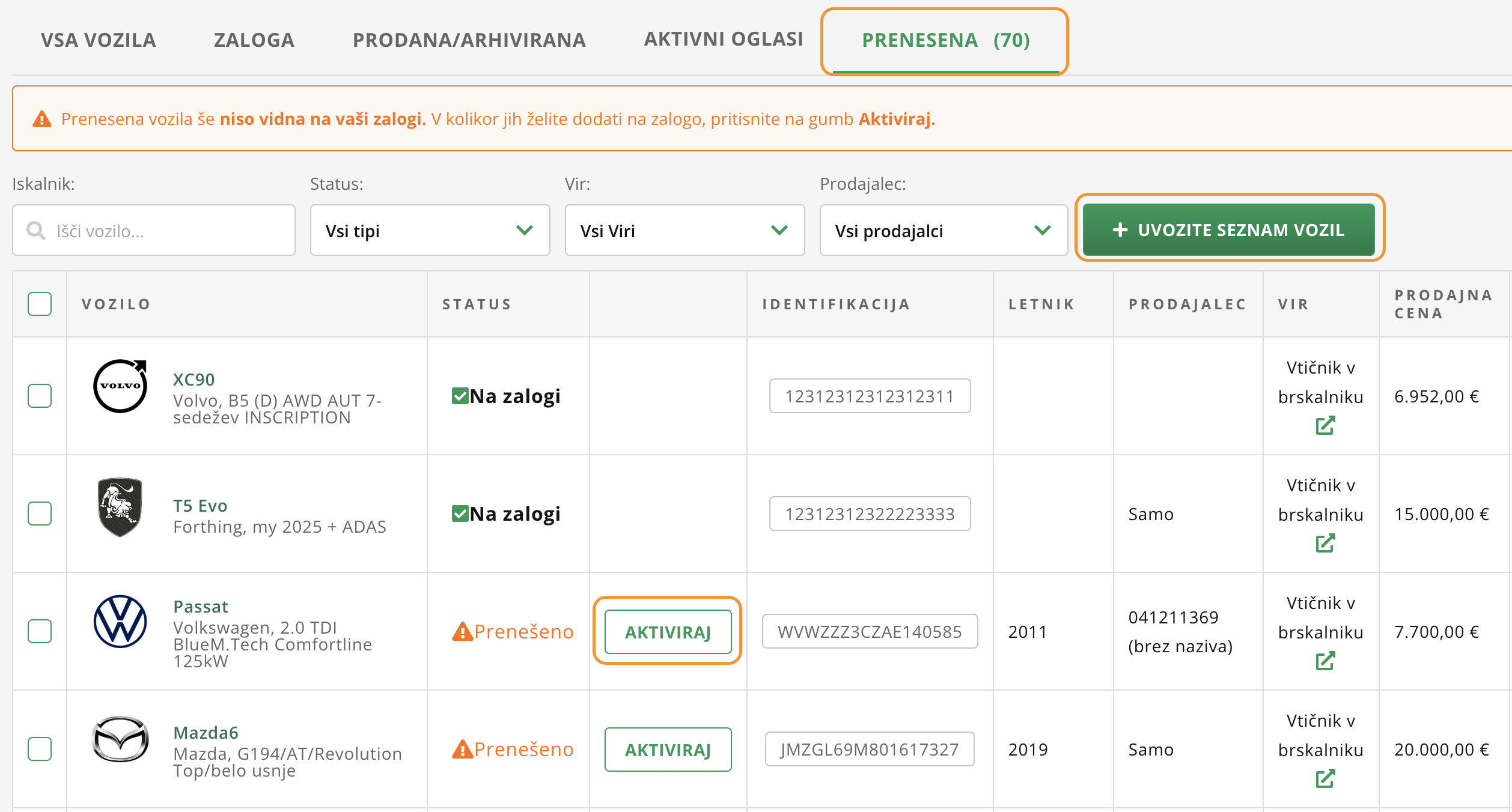 Če imaš zalogo in podatke v kakšnem excelu ali drugme programu, pa lahko celotno zalogo preneseš tudi naenkrat. To storiš pod zavihkom PRENESENA s klikom na Uvoz seznama vozil.