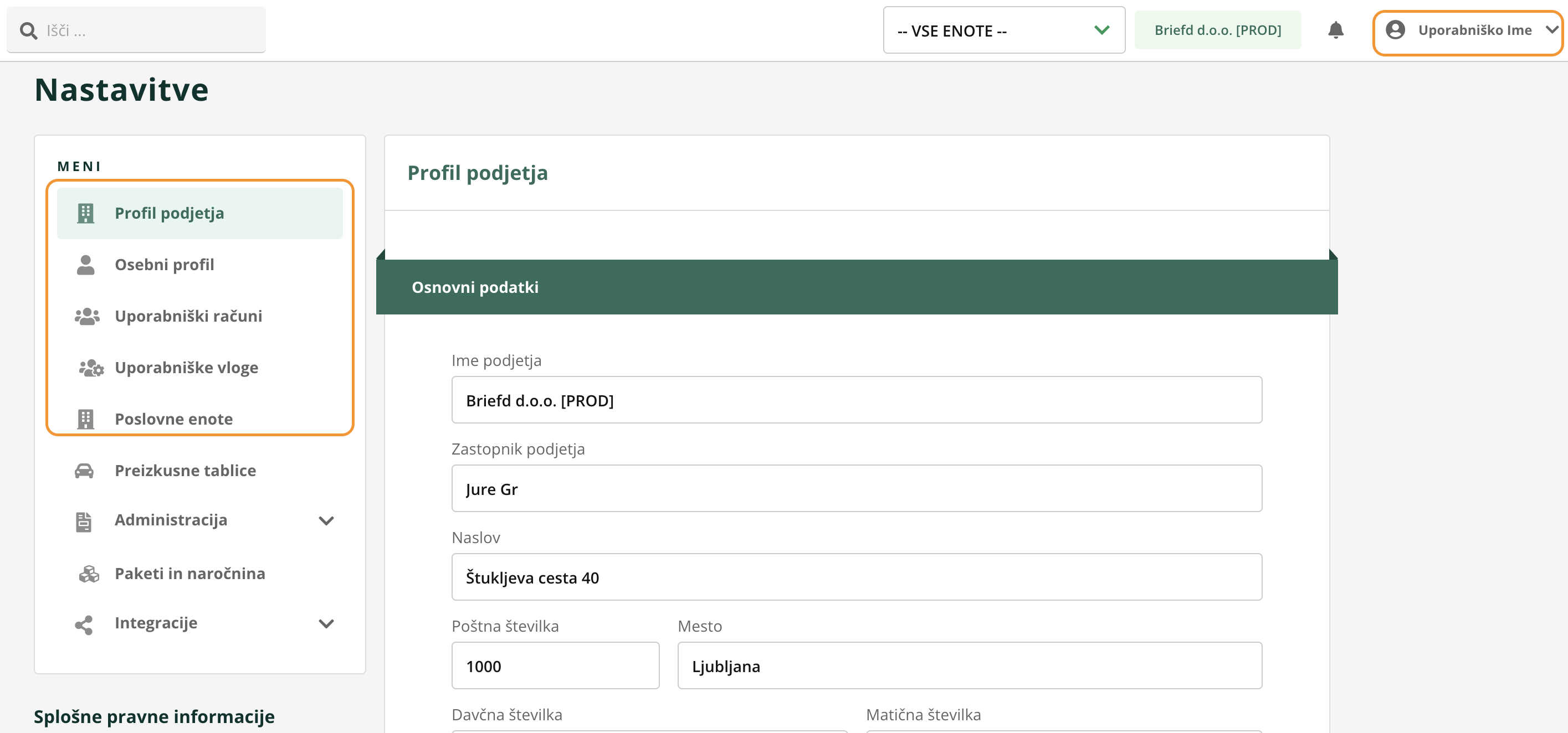 Izbrana poslovna enota bo razvidna v zgornjem meniju.