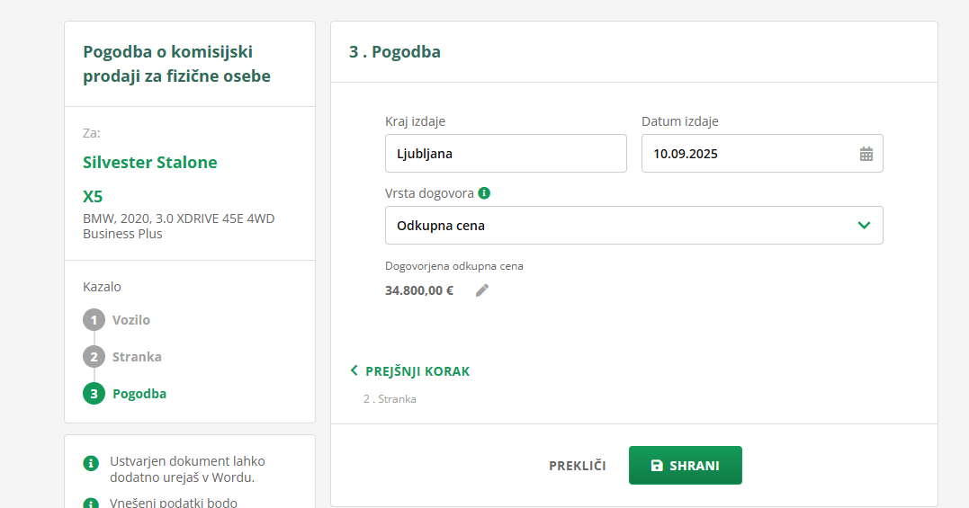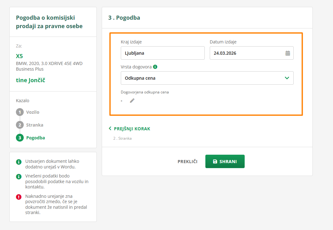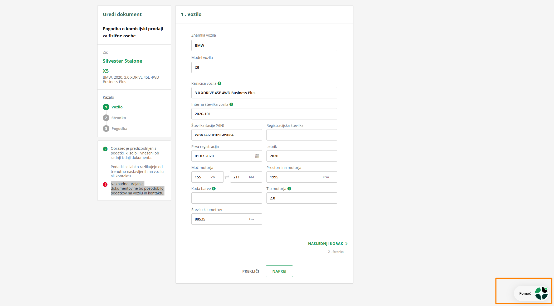 Preveri, ali so vneseni vsi obvezni podatki za vozilo in kontakt kupca.